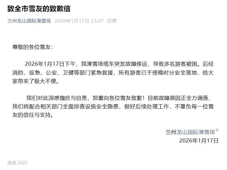 17日23时07分,龙山滑雪场通过微信公众号就此事致歉,称对此事件深感愧疚和自责,并表示目前故障原因正全力调查,将配合相关部门全面排查安全隐患,做好后续处理工作。